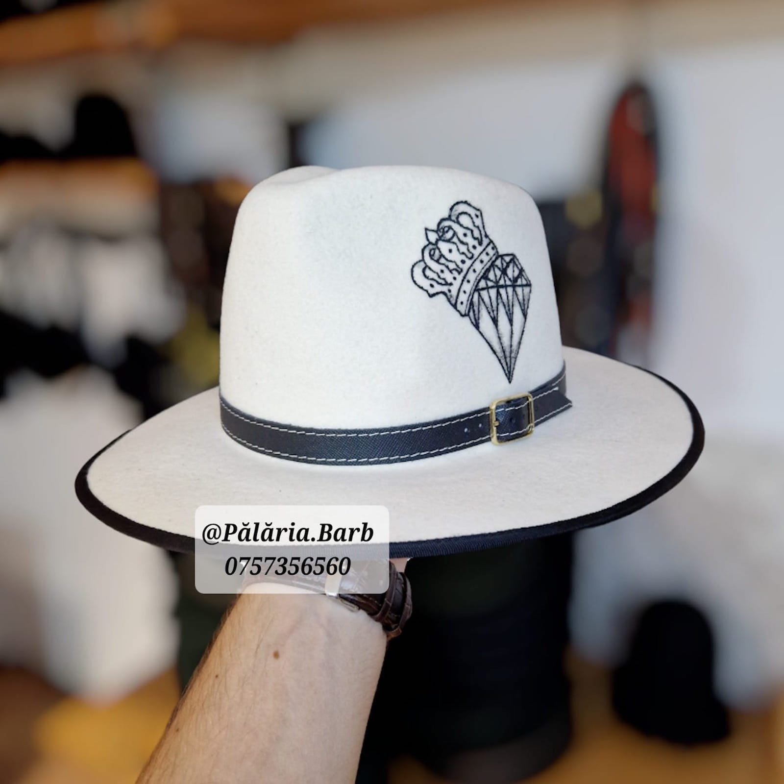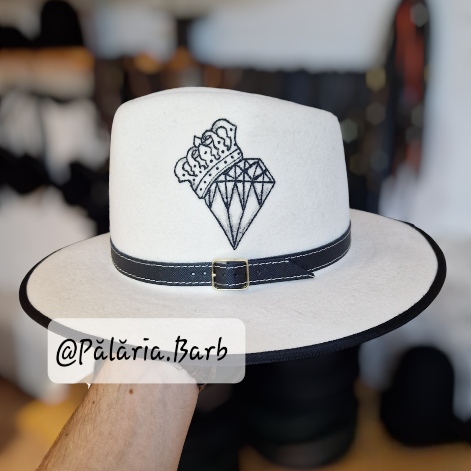 Una dintre cele mai frumoase cereri din partea clienților este pălăria albă pictată cu diamant. Se pictează cu vopsea neagră, oferind un contrast superb. La cerere se poate adăuga și un nume pe lateral. Dacă doriți și nume, activați căsuța de mai jos și scrieți numele dorit.