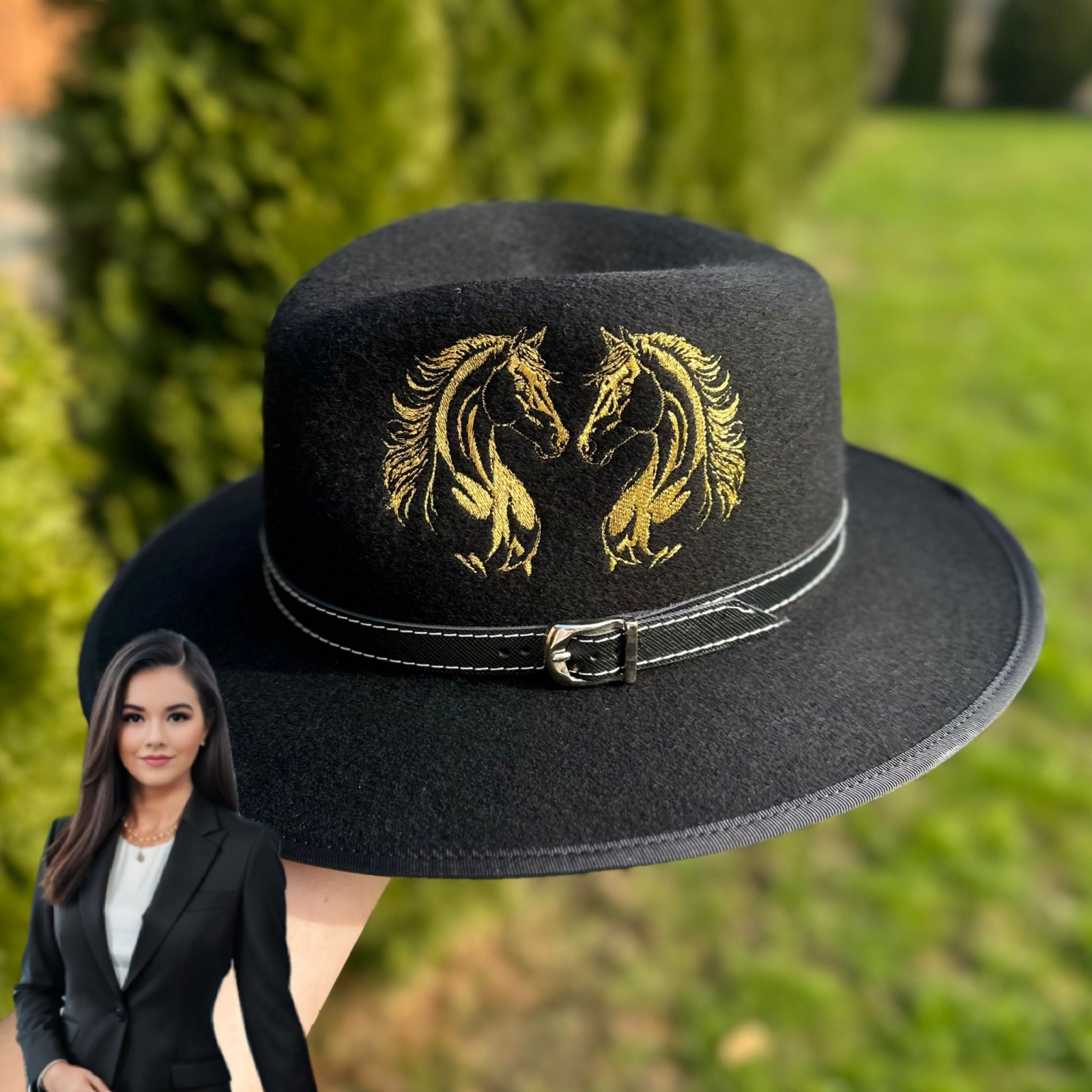 Pentru iubitorii de cai și cei care apreciază experiențele inedite, această pălărie este alegerea perfectă. Brodată cu doi cai aurii, cu pletele năluci, pălăria este un omagiu adus frumuseții și puterii acestor animale nobile. Creată atât pentru bărbați, cât și pentru femei, ea reflectă pasiunea pentru cai și pentru momentele unice petrecute în natură. Fiecare detaliu al pălăriei este gândit pentru a adăuga o notă de rafinament și unicitate oricărei ținute, iar calitatea superioară a materialelor asigură confortul și durabilitatea necesare.