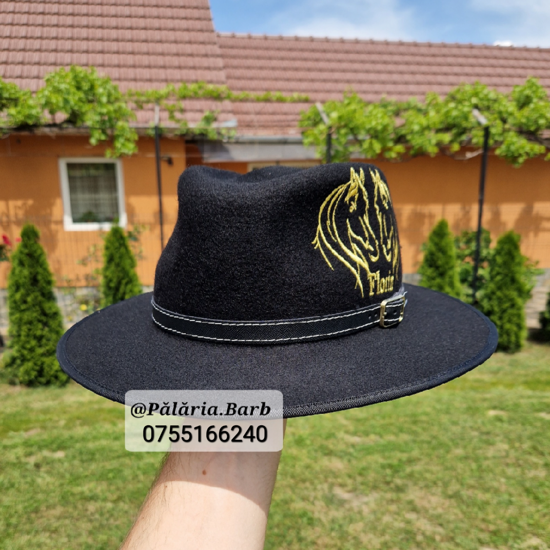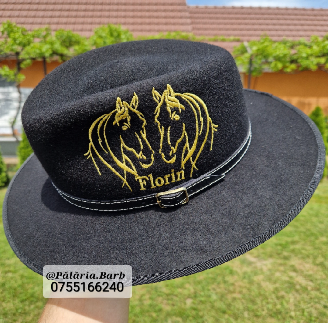 Cel mai popular produs al nostru este pălăria neagră cu 2 cai. Spre deosebire de modelul pictat, caii cusuți au o strălucire superbă în lumina soarelui. La cerere se poate adăuga și un nume între cai. Dacă doriți și nume, activați căsuța de mai jos și scrieți numele dorit.