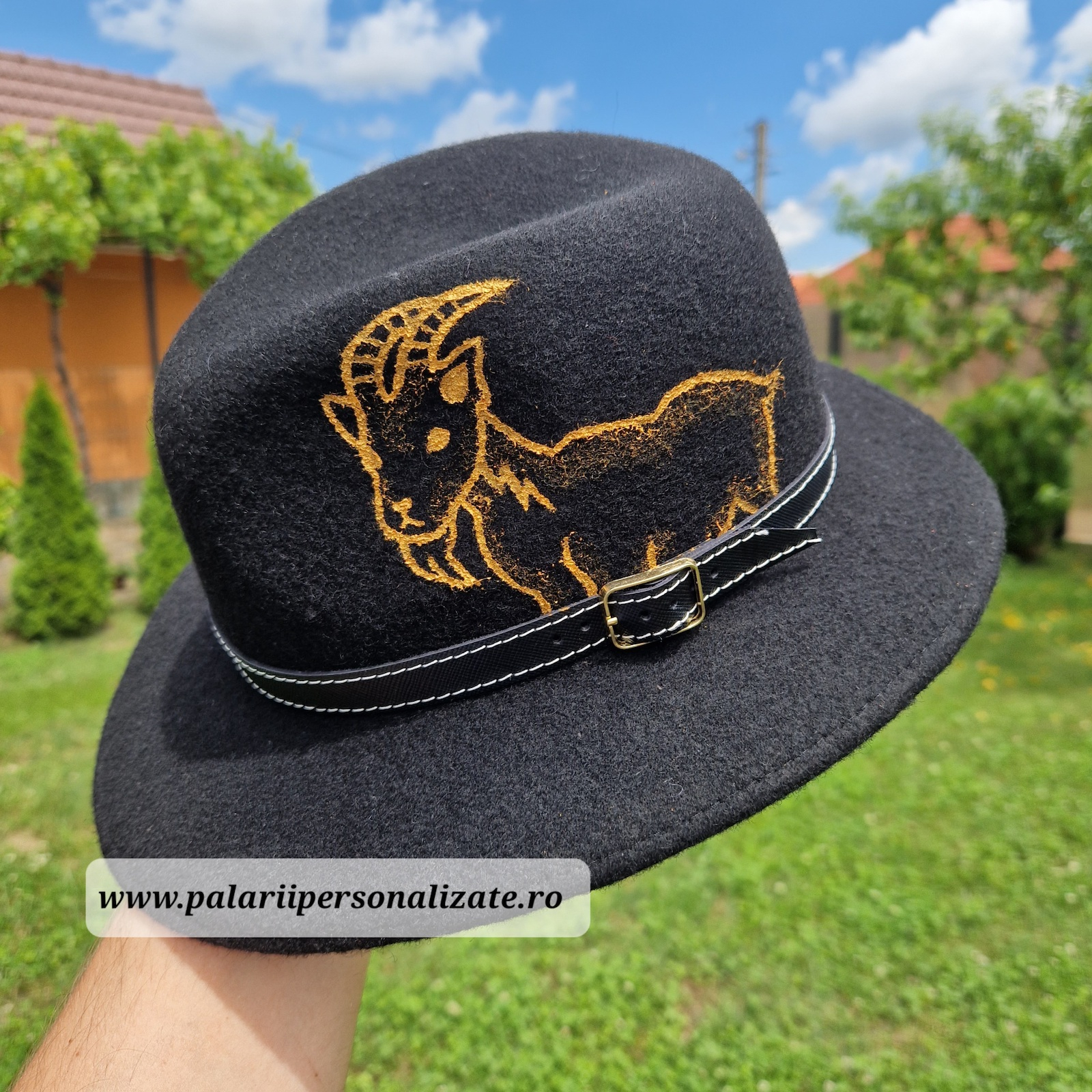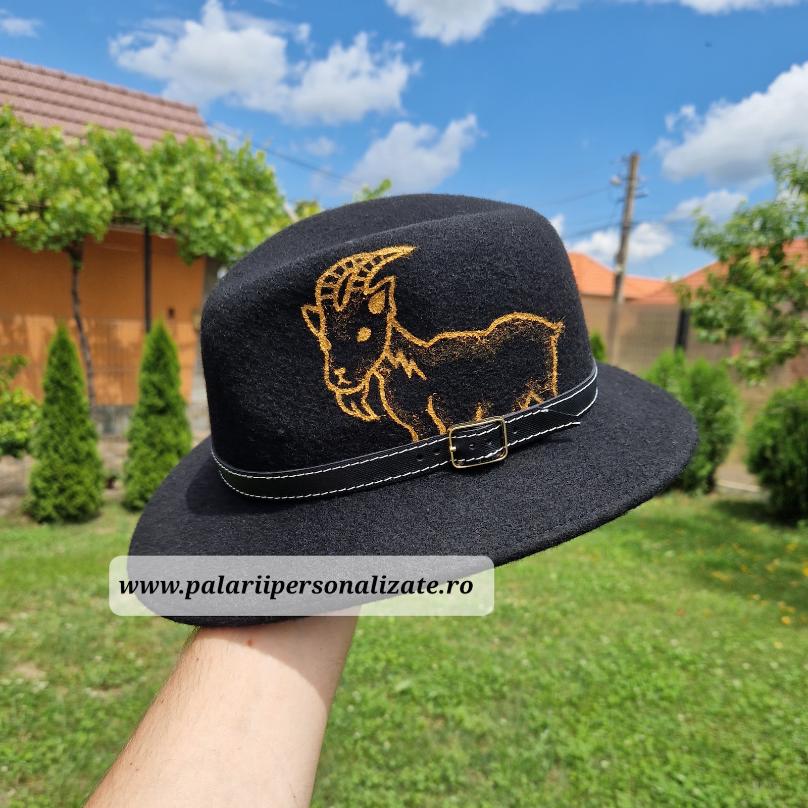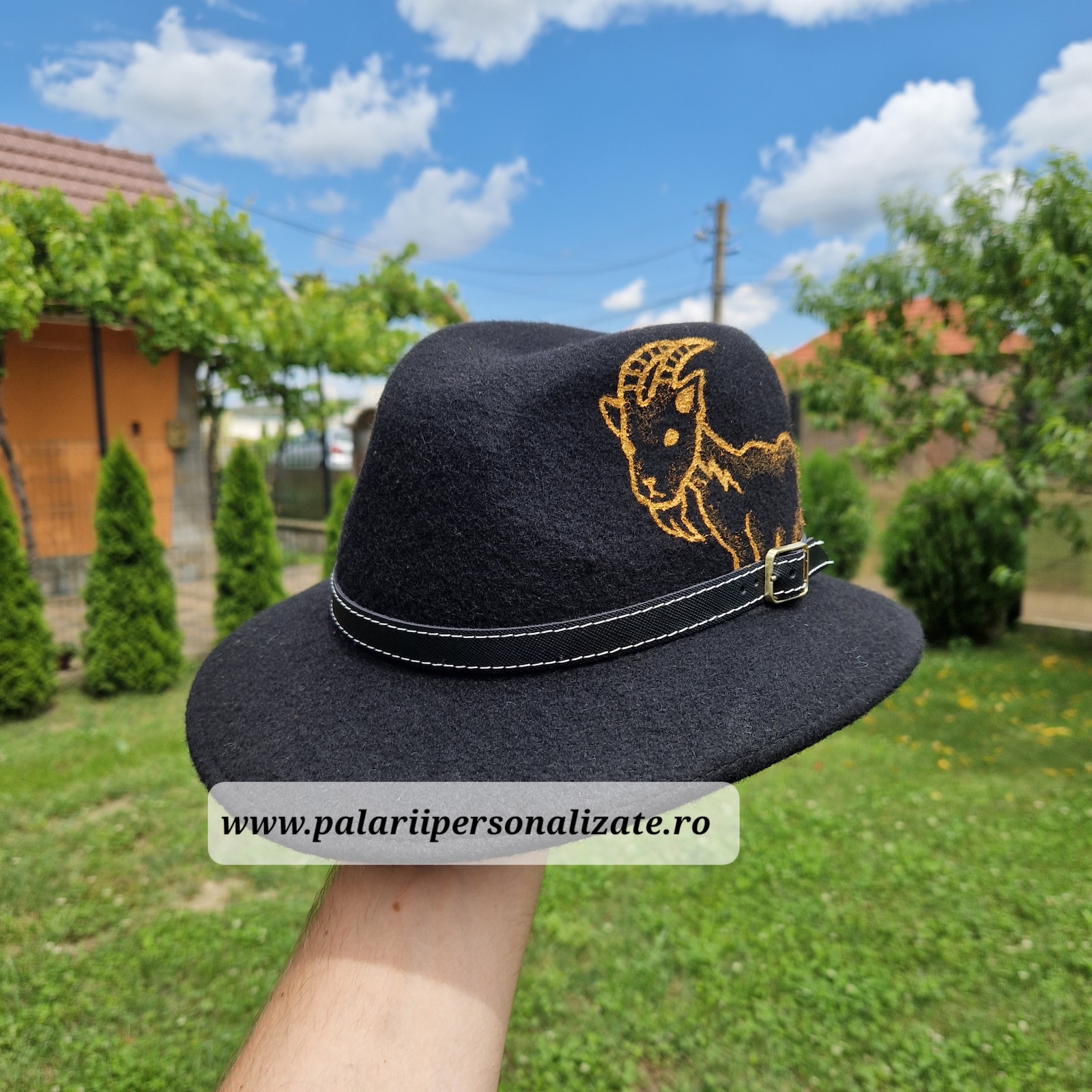 Pentru pasionații oieritului, dar nu numai, avem modelul de pălărie "Parlamentară" cu țap pictat. La cerere se poate adăuga și nume. De asemenea, se pot face 2 țapi. Dacă doriți, activați căsuța de mai jos și scrieți numele dorit.