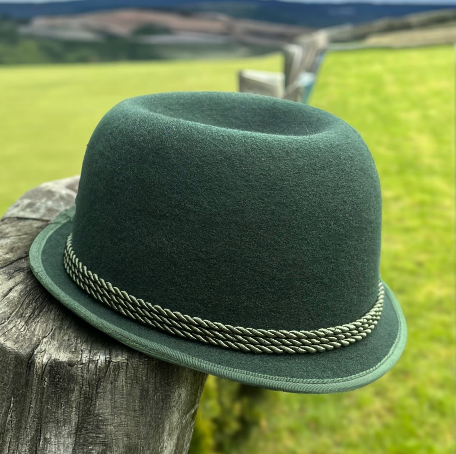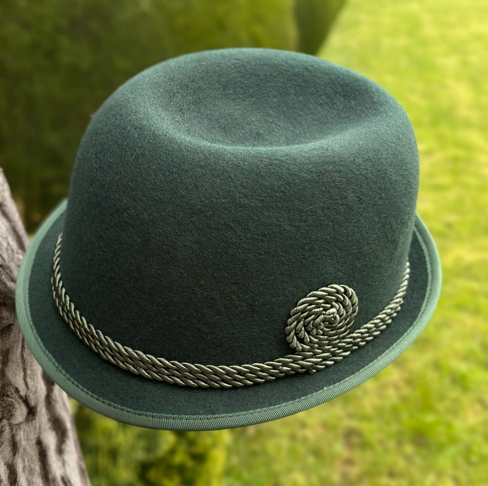 bor îngust, de aproximativ 3,5 cm, ușor întors în sus în partea din spate si putin aplecat in partea din fata, detalii care adaugă un plus de personalitate. Coroana pălăriei este ovală și adâncita în partea superioară, iar la bază este decorată cu două randuri de șnur răsucit, de culoare verde deschis cu aspect rustic, prins discret într-un element textil, lână, de aceeași nuanță cu pălăria.